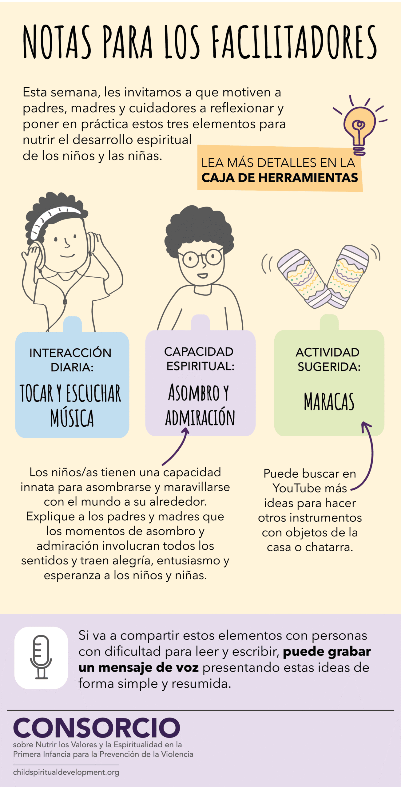 Las tarjetas de esta sección son exclusivamente para facilitadores que implementan la Caja de Herramientas. Cada tarjeta sugiere una forma diferente de combinar interacciones y actividades y proporciona guías sobre cómo presentarlas a padres, madres y cuidadores para que las practiquen con niñas y niños semanalmente.