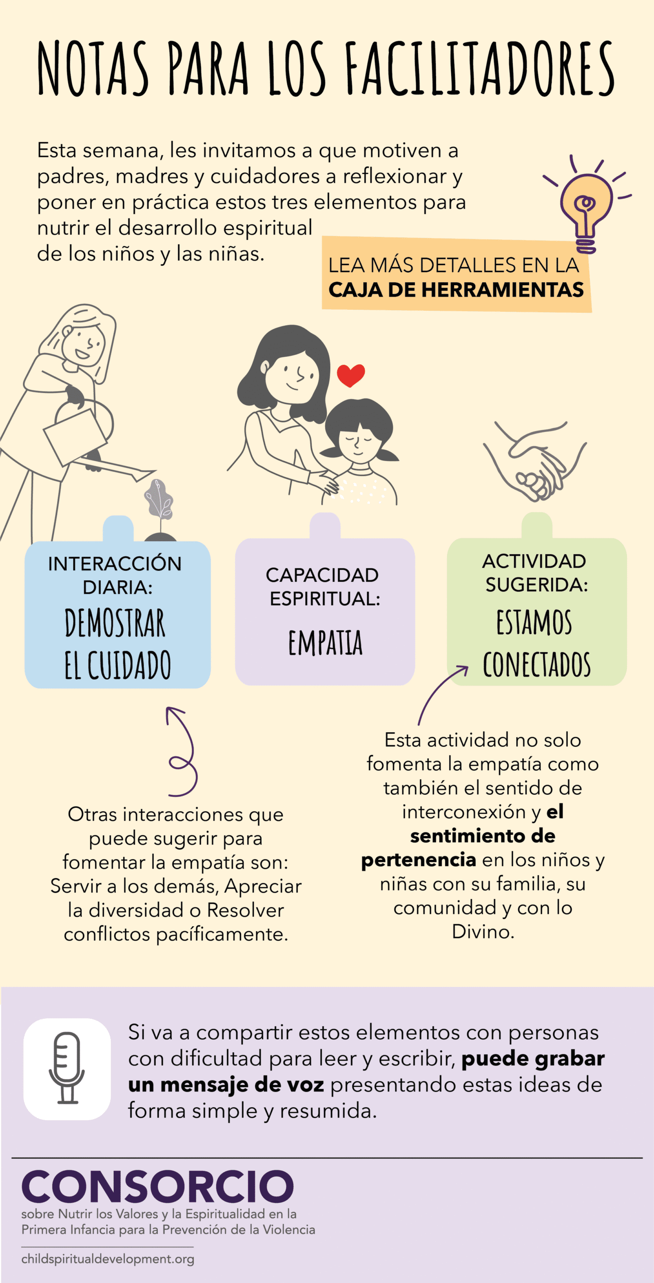 Las tarjetas de esta sección son exclusivamente para facilitadores que implementan la Caja de Herramientas. Cada tarjeta sugiere una forma diferente de combinar interacciones y actividades y proporciona guías sobre cómo presentarlas a padres, madres y cuidadores para que las practiquen con niñas y niños semanalmente.