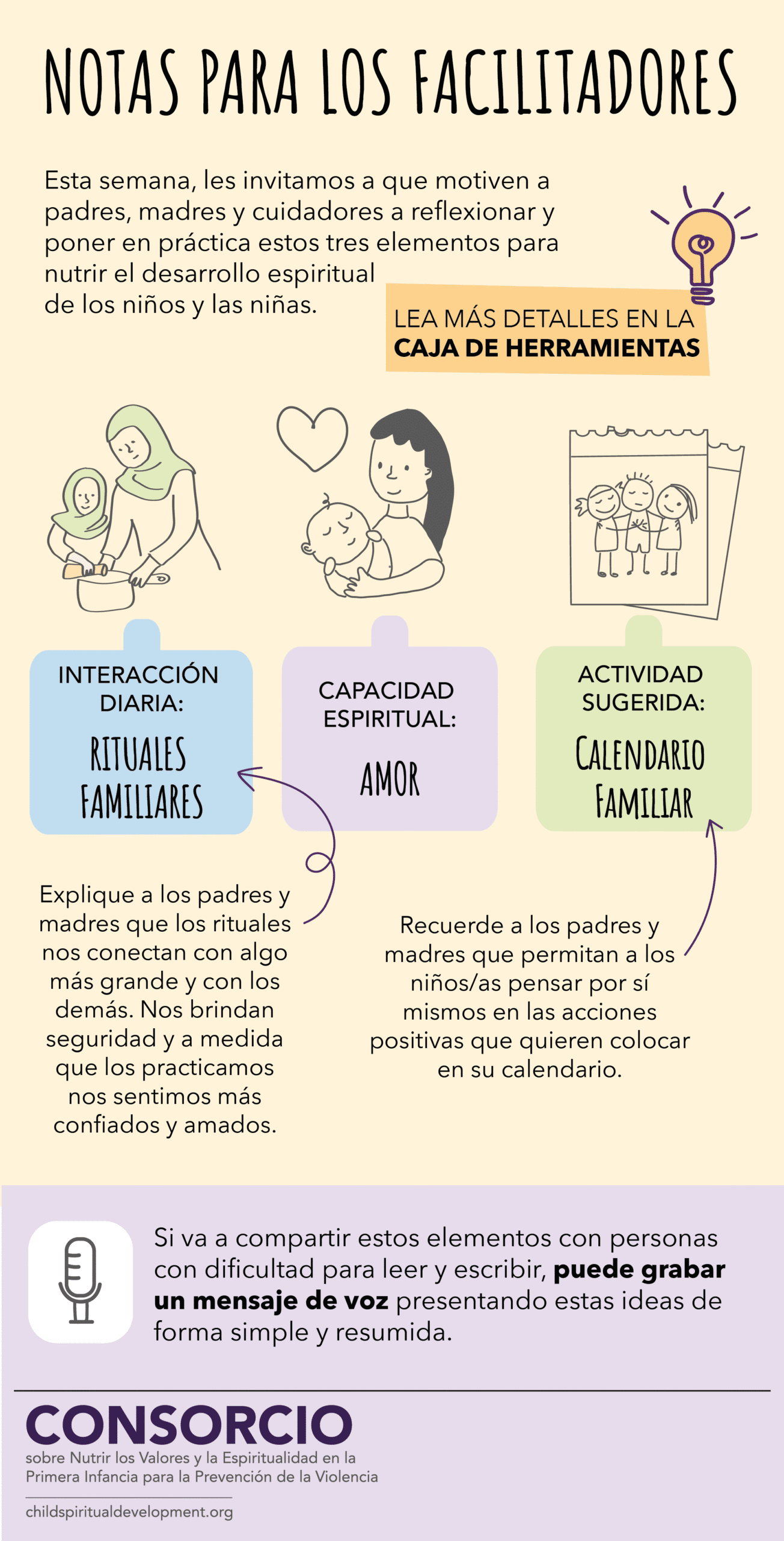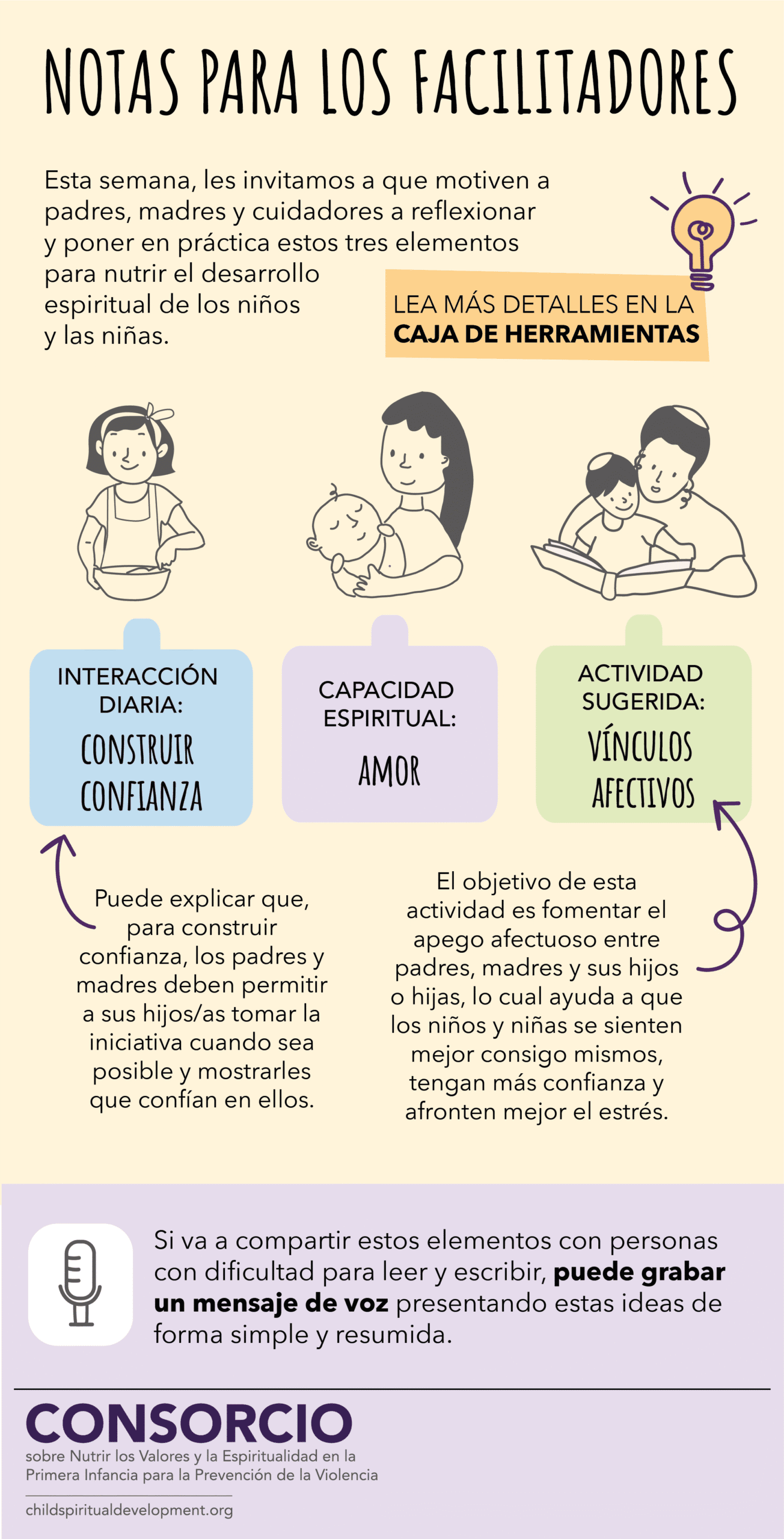 Las tarjetas de esta sección son exclusivamente para facilitadores que implementan la Caja de Herramientas. Cada tarjeta sugiere una forma diferente de combinar interacciones y actividades y proporciona guías sobre cómo presentarlas a padres, madres y cuidadores para que las practiquen con niñas y niños semanalmente.