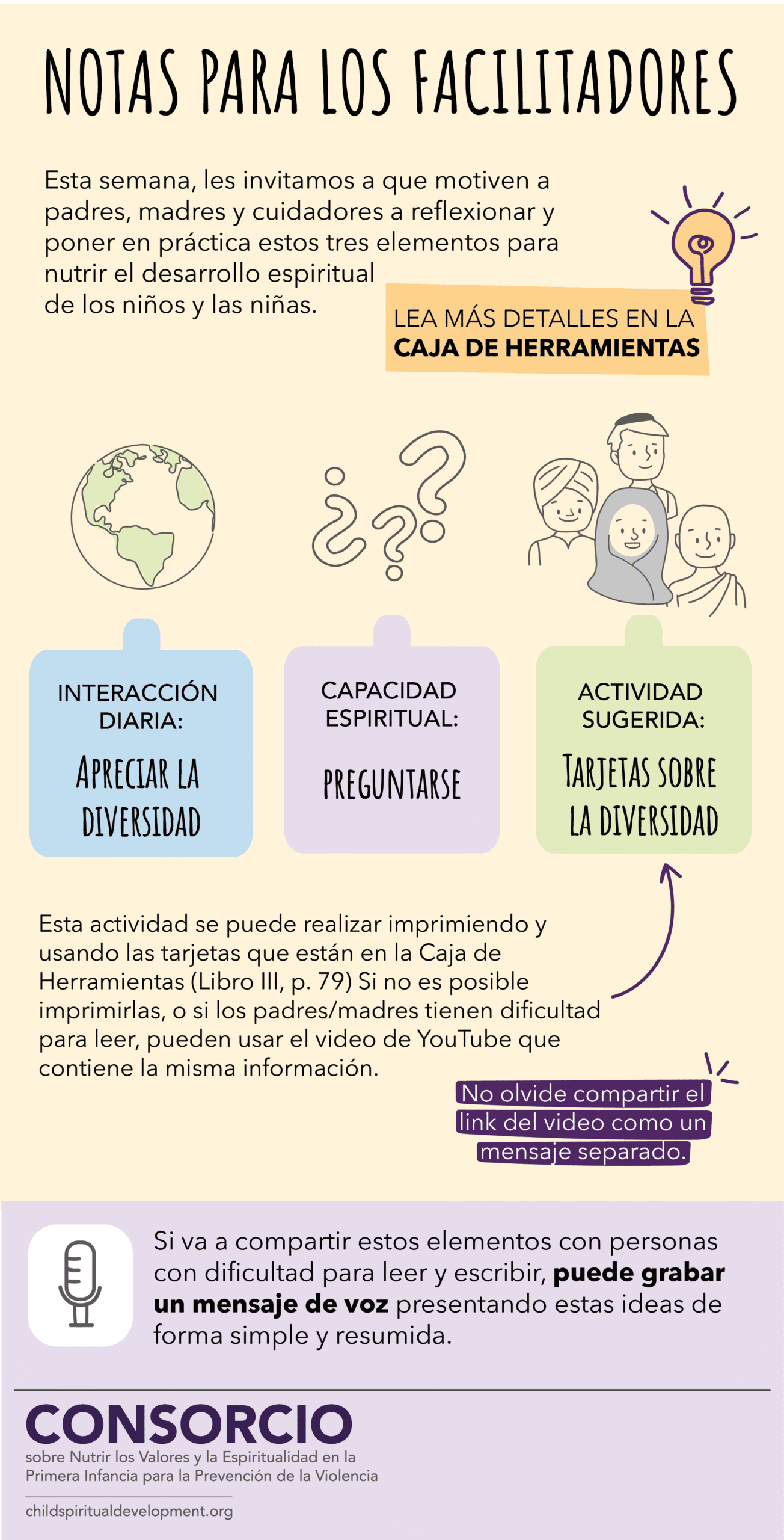 Las tarjetas de esta sección son exclusivamente para facilitadores que implementan la Caja de Herramientas. Cada tarjeta sugiere una forma diferente de combinar interacciones y actividades y proporciona guías sobre cómo presentarlas a padres, madres y cuidadores para que las practiquen con niñas y niños semanalmente.
